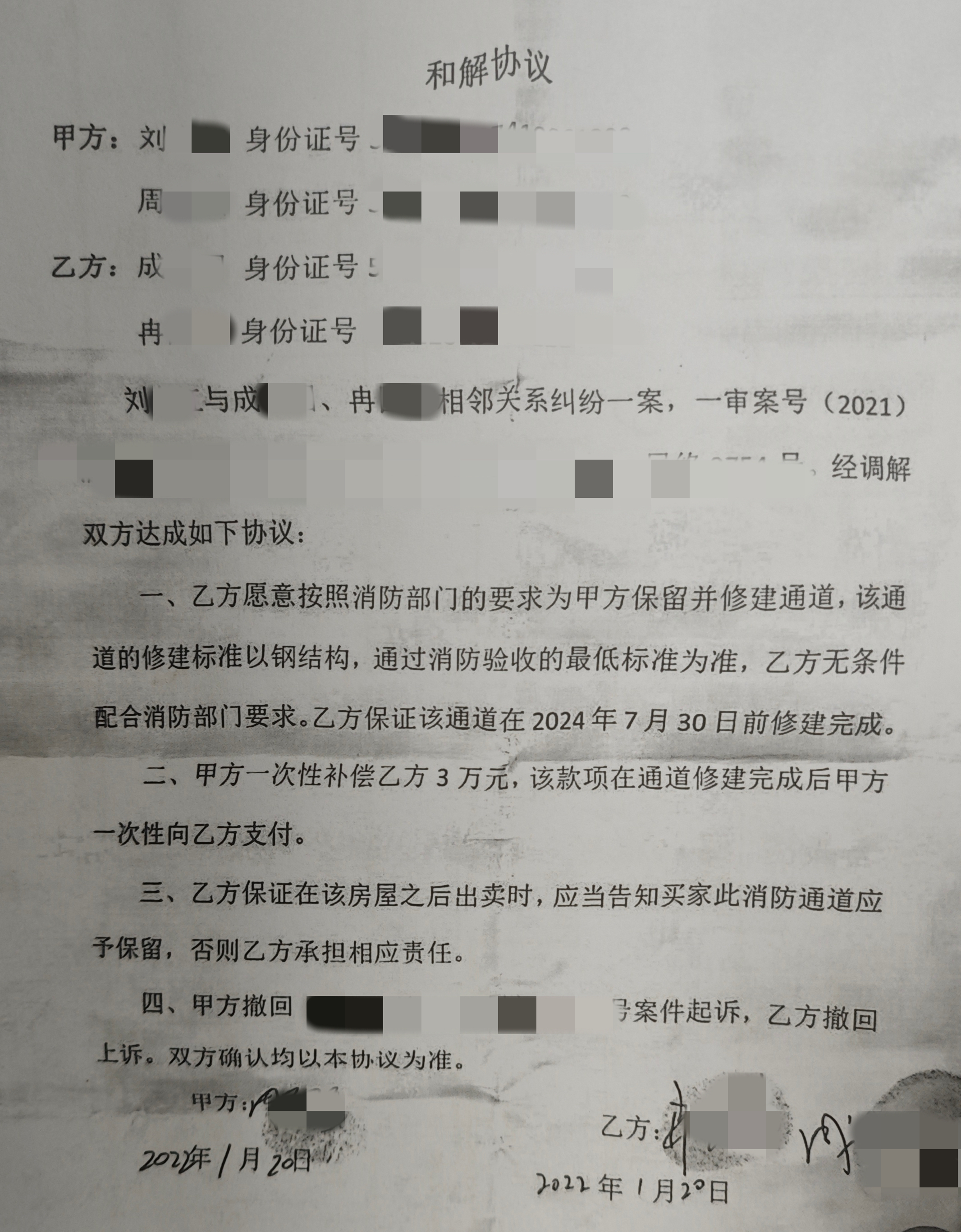 在周先生看来,达成协议就意味着事情得以顺利解决。但没想到,冉某等人对消防通道的恢复方案,却让周先生难以接受。