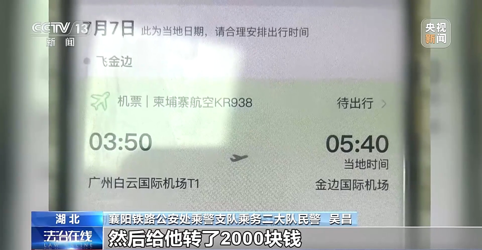襄阳铁路公安处乘警支队乘务二大队民警 吴昌:然后他就把他机票给我看了,然后包括他在柬埔寨金边,网上订酒店的记录都有。因为我和他交流的时候,感觉他有点不听我的,像被别人洗脑了一样,你跟他说啥他都不听,然后他爸妈也是给他一直打电话,他也不接。