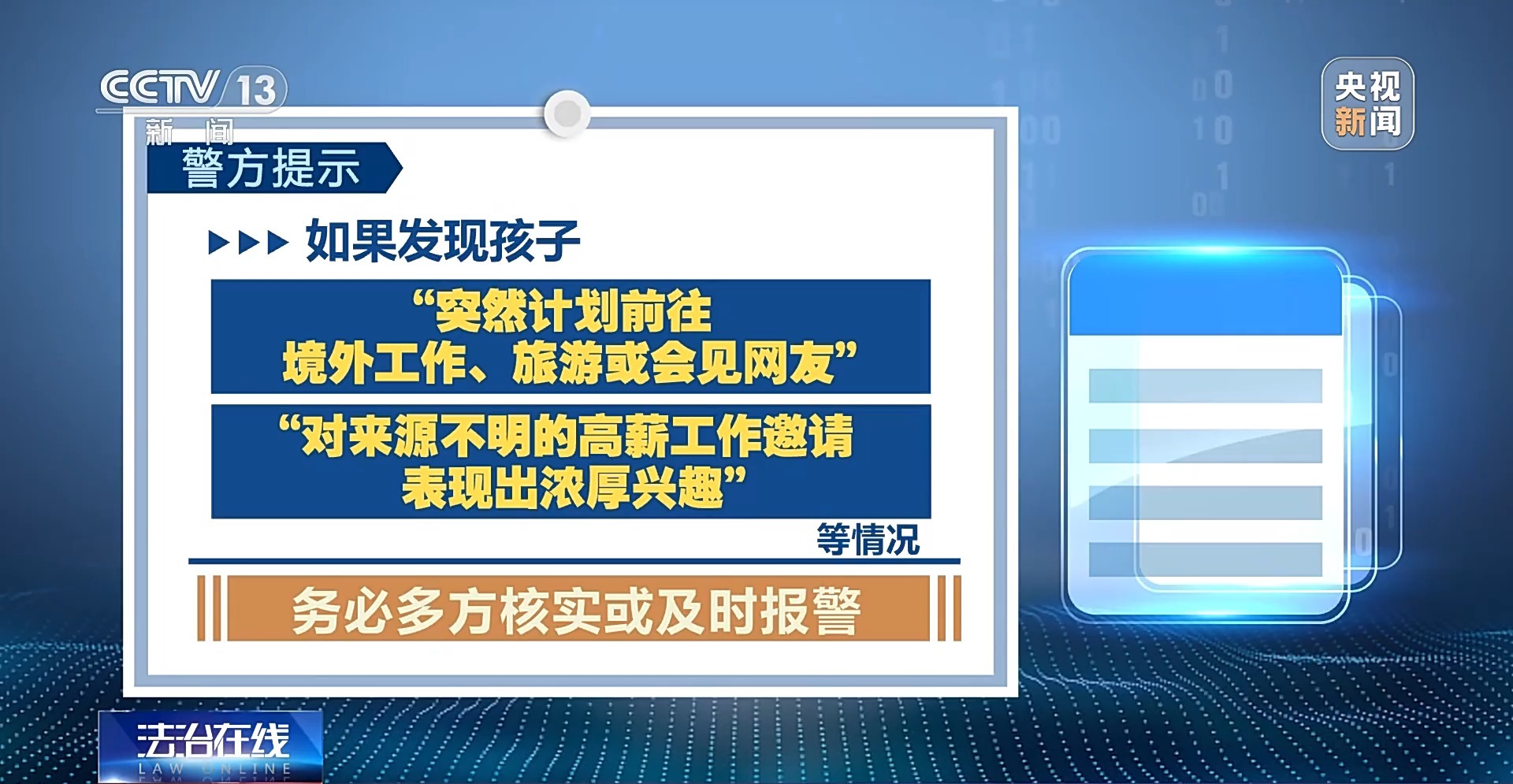 警方提醒广大公众,如果遇到“零门槛国外高薪岗”“包吃住、报销机票、专人接送”等招聘信息,务必提高警惕,这很可能就是骗局。家长也应密切关注孩子在求职期间的异常行为,如果发现孩子“突然计划前往境外工作、旅游或会见网友”“对来源不明的高薪工作邀请表现出浓厚兴趣”等情况,务必多方核实或及时报警。
