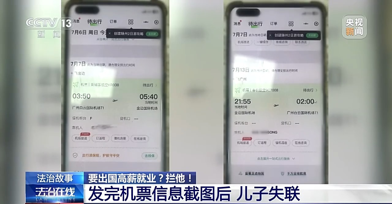 然而,在随后的聊天中,尽管薛先生多次劝导,小松依然坚持要出国,还发来了两张航班信息截图。从截图中,薛先生发现,小松已经预订了一张7月7日凌晨3点多从广州飞往柬埔寨的机票,以及7月13日晚上9点多从柬埔寨返回广州的机票。薛先生说,发完截图后,儿子小松便不再回复他的信息。