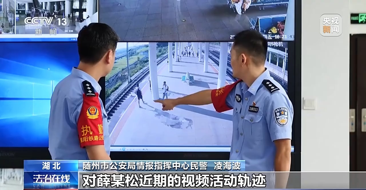 随州市公安局情报指挥中心民警 凌海波:请他们立即联系列车上的乘警,请他立即在车厢查找薛某松。其次我们也同步开展了对薛某松近期的视频活动轨迹,以及他当日进入随州南站闸机口,先后有没有同行人员进行了深度分析研判。