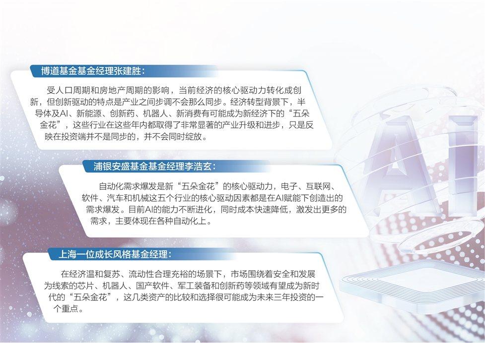 上海一位成长风格基金经理认为,在经济温和复苏、流动性合理充裕的场景下,市场围绕着安全和发展为线索的芯片、机器人、国产软件、军工装备和创新药等领域有望成为新时代的“五朵金花”,这几类资产的比较和选择很可能成为未来三年投资的一个重点。