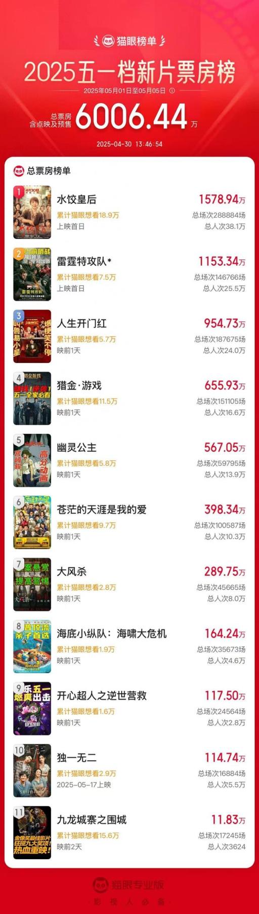 据网络平台数据,截至4月30日13时46分,2025年五一档总票房(含点映及预售)破6000万广瑞网 ,《水饺皇后》《雷霆特攻队*》《人生开门红》分列新片票房榜前三位。